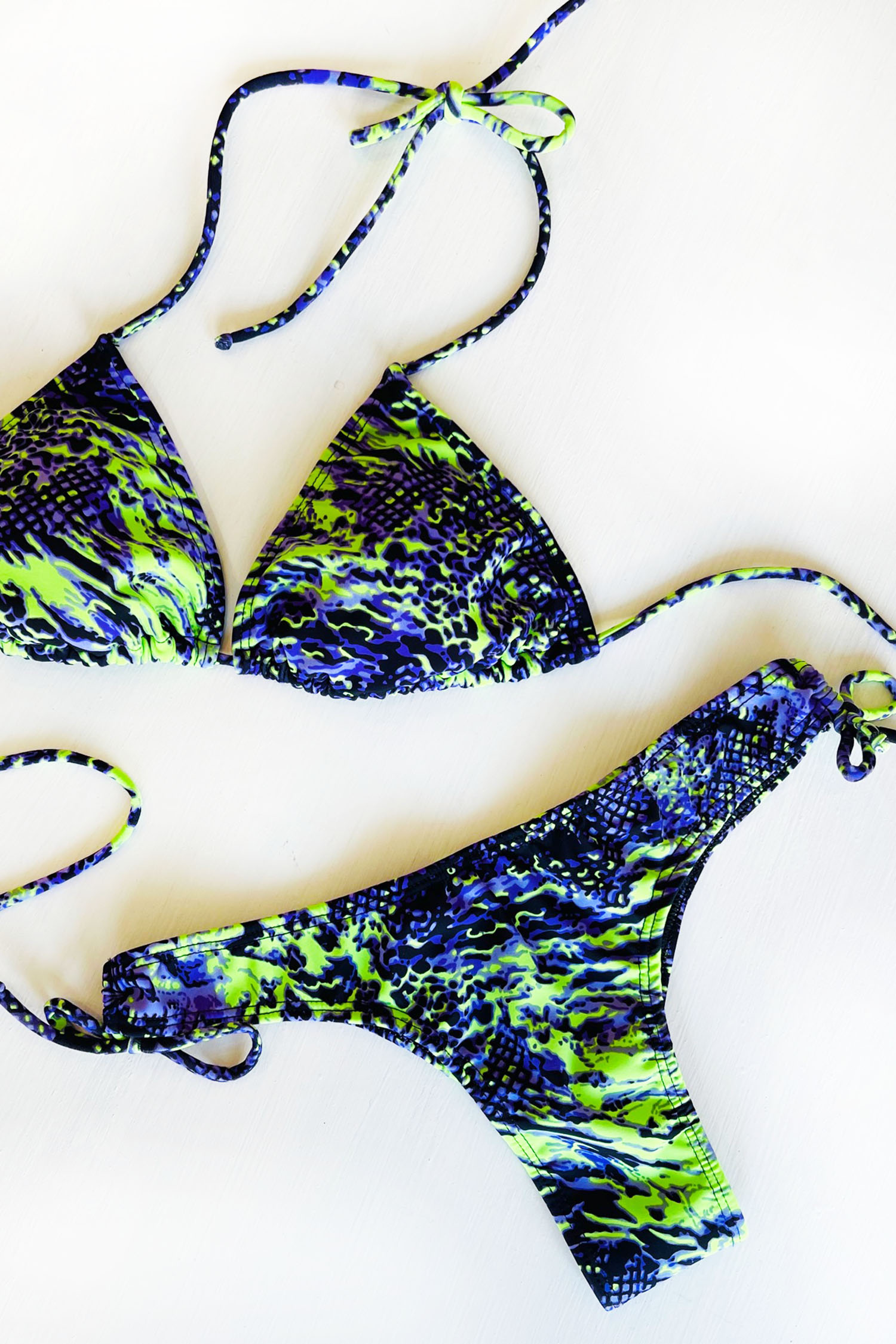 Bombacha semiless regulable, tiene el corte justo entre una vedetina y una bombacha less. Detalle de tiras para anudar y regular el talle en los laterales. El estampado Print hecho en serigrafía marca la diferencia, por sus colores vibrantes. Un verdadero Hit de la temporada.